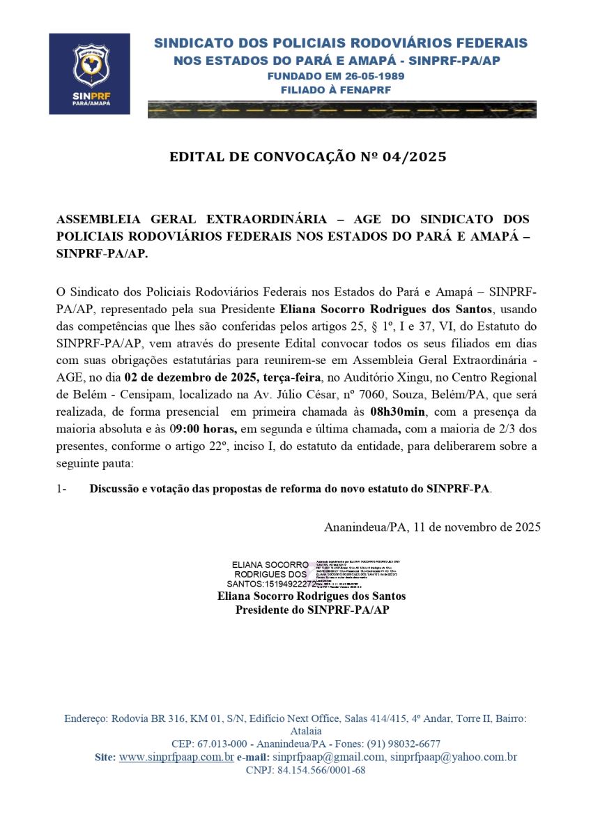 ASSEMBLEIA GERAL EXTRAORDINÁRIA – AGE DO SINDICATO DOS POLICIAIS RODOV...