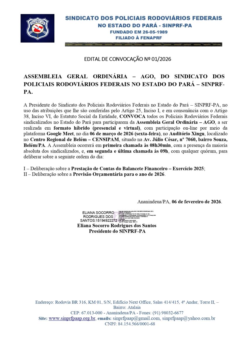 ASSEMBLEIA GERAL ORDINÁRIA – AGO, DO SINDICATO DOS POLICIAIS RODOVIÁRI...