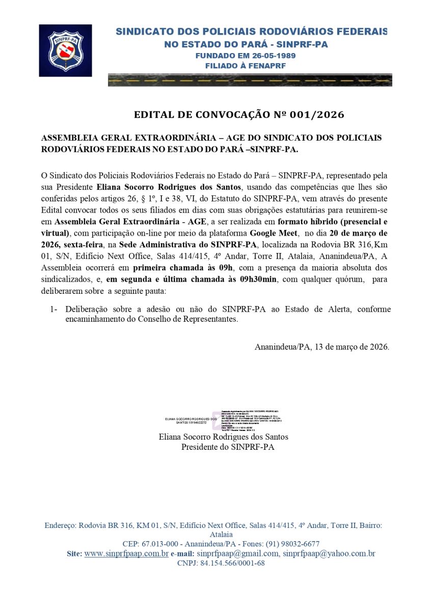 ASSEMBLEIA GERAL EXTRAORDINÁRIA – AGE DO SINDICATO DOS POLICIAIS RODOV...